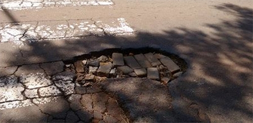 Av. Irmãos Pereira, esquina com rua São Paulo. Quem é de Campo Mourão sabe: é centrão da cidade. O buraco no meio da pista tava tão fundo que alguém deu um jeitinho para amenizar a situação: colocou blocos de “pêiver” no local. Portanto, na terra do carneiro no buraco, nem bloco de concreto escapa...