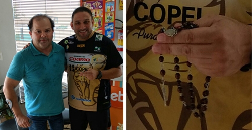 O professor Agnaldo Feitoza entregou um terço para o técnico do Campo Mourão Basquete, Emerson de Souza. Foi o pagamento de uma promessa feita durante o jogo contra Brasília (Campo Mourão venceu por 78 a 76). Feitoza ainda está devendo uma bíblia a Souza, fruto de outra promessa feita na vitória sobre o Mogi (95 a 94). Ah, pensa que é fácil vida de torcedor, é?...