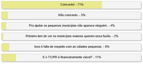 "O que você achou da proposta do Tribunal de Contas de fusões de municípios com menos de 5 mil habitantes, considerados financeiramente inviáveis pelo órgão?" Em enquete de Boca Santa, 71% dos votantes disseram que concordam com a ideia. Apenas 5% voram na opção “não concordo”. Se bem que 11% querem sabe se o TC também é “financeiramente viável”. O resultado completo pode ser visto no quadro acima.