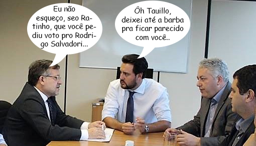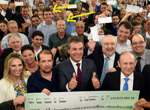O governador Beto Richa chamou os prefeitos do Estado inteiro, nesta segunda-feira, para anunciar a distribuição de um ICMS extra. Agora olha só quem apareceu de Moreira Sales por lá. O ex-prefeito Luiz Volpato e o ex-vereador Rafael Bolacha, que perdeu a eleição para prefeito. Pudera. A cidade ainda não sabe quem é o prefeito. O mais votado Hugo Berti não pode assumir e o município está, por enquanto, sob o comando do presidente da Câmara Tiago Albano