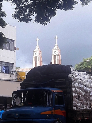 “10h20 desta quarta-feira. As torres da Catedral, a fundo, não mentem: o caminhão está passando pela av. Capitão Índio Bandeira, centrão de Campo Mourão”.