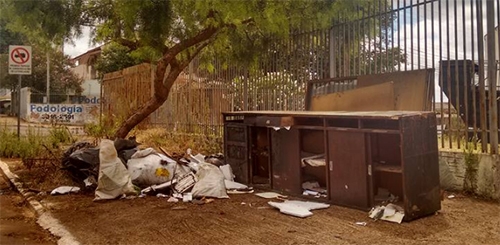 Na av. Irmãos Pereira, perto da rua Guarapuava, tem lixo e balcão no meio da calçada. Não sobrou espaço para o pedestre passar. A não ser o meio-fio!