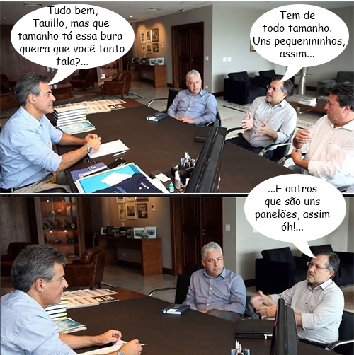 Olha aí a versão “balãozinho” da audiência que o prefeito Tauillo Tezellil teve no início da semana com o governador Beto Richa. Tudo acompanhado de perto pelo secretário de Estado Douglas Fabrício (Esporte e Turismo) e pelo deputado estadual Márcio Nunes. Cá pra nós: Tauillo falou dos buracos, não falou?...