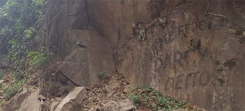 Às margens da BR-487, entre Luiziana e Iretama, ainda é possível ver propaganda eleitoral do candidato a deputado federal Darcy Deitos. Tudo pintado em paredes rochosas. Deitos disputou a Câmara Federal em 1986 e 1990, ou seja, a propaganda está indo para, no mínimo, 27 anos. Foto: Leandro Giovani de Almeida