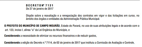 O prefeito Tauillo Tezelli assinou decreto que determina a revisão de contratos em andamento em todos os setores da prefeitura.