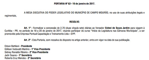 ...Sidnei Jardim! O veterano vereador (está no sexto mandato) pegou 2,70 diárias – R$ 810 – para uma viagem a Curitiba. Foi participar entre os dias 18 e 20 do curso “Início de Legislatura nas Câmaras Municipais”, promovido pela empresa Pontual Capacitação e Treinamento Ltda. Hummmmmm...