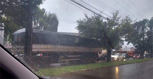 “Faça chuva ou faça sol lá estão as carretas passando pelo centro de Campo Mourão. Essa aí foi vista na manhã chuvosa desta terça-feira, atravessando a av. Goioerê”.
