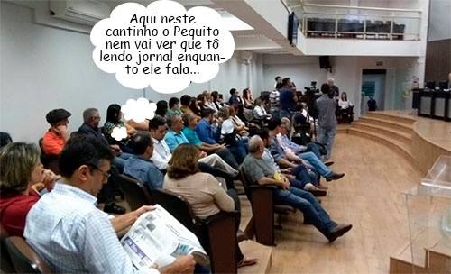 O clic é da semana passada, durante a audiência pública em que a prefeitura prestou contas à Câmara dos primeiros quatro meses do ano. Quando o secretário Beto Pequito (Fazenda) começou a falar, o vice-prefeito e secretário Beto Voidelo (Ação Social) ainda colocava a leitura do jornal em dia.
