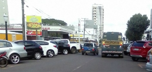 Rua Mato Grosso, centro de Campo Mourão, por volta das 16h desta segunda-feira. Carro-forte (de novo!) para em fila dupla e obriga veículos a trafegarem pela contramão.