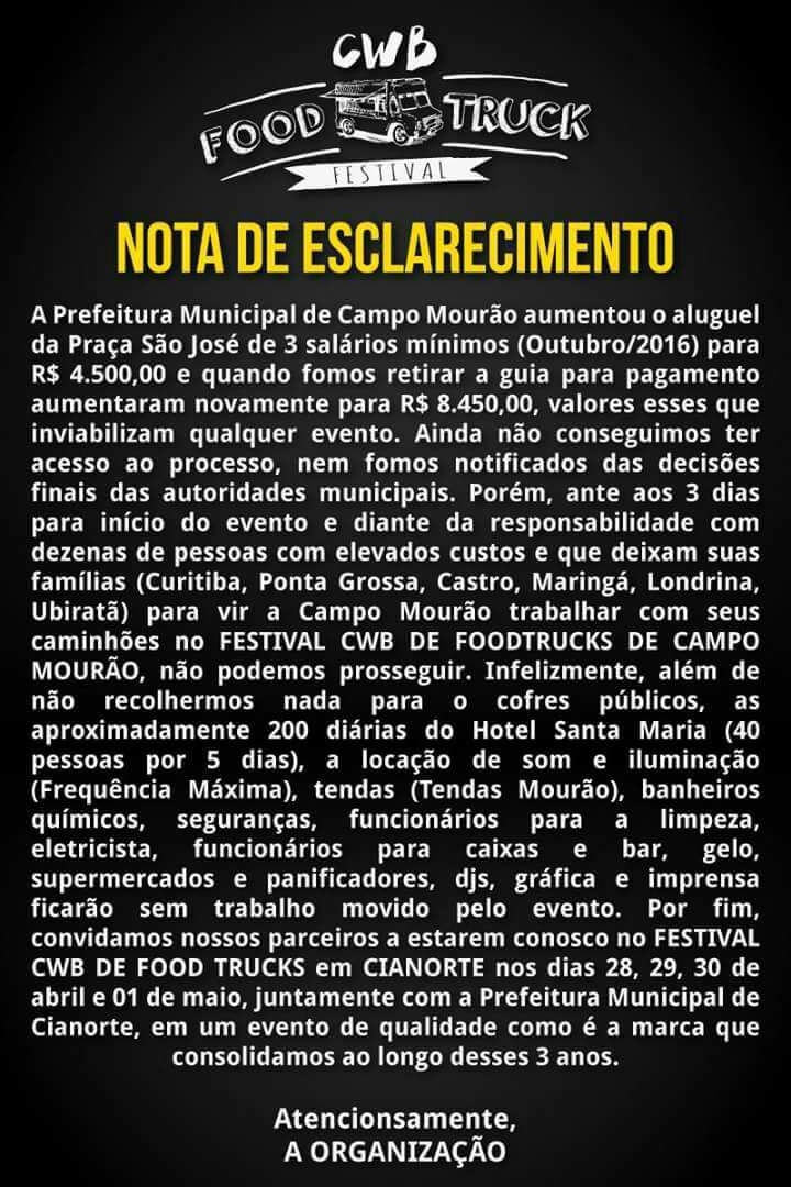 A organização do Festival de Food Truck divulgou nota nesta terça-feira lamentando a posição da prefeitura.