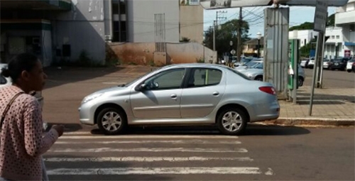 Carro estaciona sobre a faixa de pedestre, nesta terça-feira, na av. Irmãos Pereira, esquina com rua Harrison José Borges, no centro de Campo Mourão. Fraterno Maria Nunes