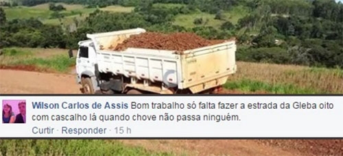 “Bom trabalho. Só falta fazer a estrada da Gleba 8 com cascalho. Lá, quando chove, não passa ninguém”.