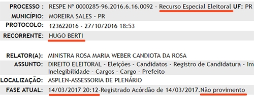 O Tribunal Superior Eleitoral indeferiu o recurso do ex-prefeito de Moreira Sales, Hugo Berti, e o manteve inelegível.