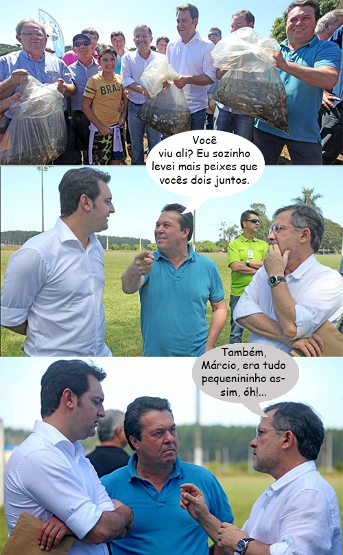 Com a presença do secretário de Estado Ratinho Jr (Desenvolvimento Urbano), a soltura de 50 mil peixes, neste sábado, atraiu políticos da reigão. Ratinho Jr ajudou a carregar a peixarada e tudo, assim como o deputado Márcio Nunes e o prefeito Tauillo Tezelli. O presidente da Câmara, Edson Battilani, também estava por lá.