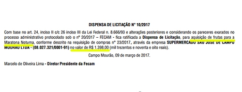 Aconteceu no fim de semana a primeira etapa do ano da “Ligue Night Run”. É o novo nome da antiga Maratona Noturna, que agora tem um patrocinador, que banca quase tudo e cobra inscrição. Pelo menos uma conta, no entanto, ainda ficou para a prefeitura. “Órgão Oficial” desta terça-feira trouxe a publicação da dispensa de licitação para a compra de frutas para o evento. Valor da conta: R$ 1.398. Digamos que, literalmente, o “abacaxi” ficou pra Fecam...
