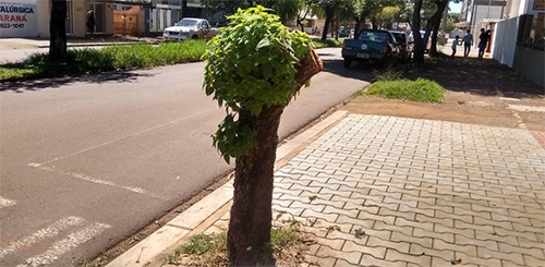 Na esquina da av. Goioerê com a rua Interventor Manoel Ribas a ventania derrubou galhos de uma árvore. A prefeitura foi lá e cortou o problema “quase” pela raiz. E lá se foi a árvore cheia de flores, que coloria a avenida. Mas não é que o “toco” que restou está brotando? Portanto, viva a natureza!...