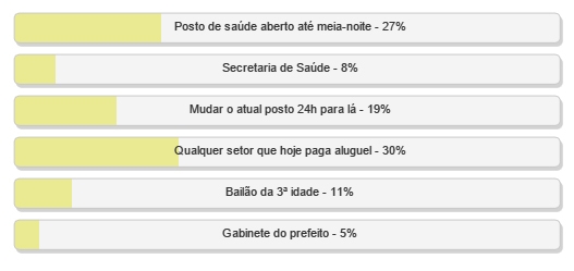 “Posto de saúde aberto até meia-noite” teve 27% e “Mudar o atual posto 24h pra lá” 19%.