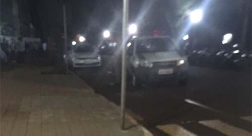 Em frente à faculdade Integrado, em Campo Mourão, viatura da PM estaciona de forma estranha e atrapalha a vaga para deficientes.
