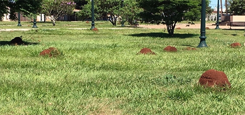 “Cupins na praça Alvorada, no Lar Paraná. São mais de 30. Há cerca de um mês funcionários da prefeitura esteviram no local cortando a grama. Fizeram até os acabamentos em volta dos cupins, mas não retiraram nenhum deles”.