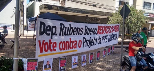 Sexta-feira de protestos por todo o País contra a proposta de reforma da Previdência e contra o projeto da terceirização, que já foi aprovado pelos deputados federais, mas ainda aguarda a sanção do presidente Michel Temer. Em Campo Mourão houve mobilização no calçadão, com a distribuição de panfletos, a colocação de faixas e um sistema de som com informações a respeito dos projetos. Um dos panfletos traz a foto (e o nome) dos deputados do Paraná que votaram a favor da terceirização. Um deles é o mourãoense Rubens Bueno.