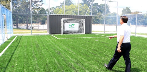 A quadra, com alambrado e arquibancada, vem em contêineres que são usados para vestiários.