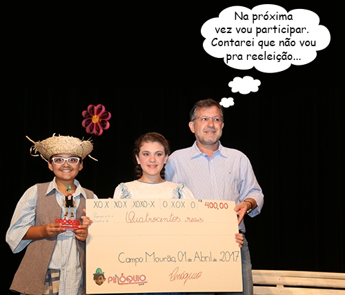 O clic é deste sábado, na hora da entrega da premiação do 24º Concurso Pinóquio de Causos e Mentiras. O prefeito Tauillo Tezelli entregou o checão simbólico de R$ 400 a Cecília Yumi e Ana Luíza Ávila, que faturaram o primeiro lugar na categoria mentira infantil. A mentirinha delas? “O caso da linguiça”.