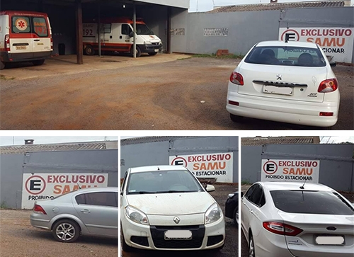 Em dois dias, quatro flagras de carros estacionados na área exclusiva do Samu, em Campo Mourão. Apesar o enorme aviso no muro, a cena é comum, inclusive com vários registros já publicados neste espaço. Os veículos acabam atrapalhando a saída das ambulâncias que precisam ficam fazendo manobras para atender emergências.