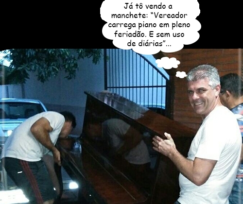 O clic é deste fim de semana prolongado, quando o vereador Edilson Martins teve que, literalmente, carregar piano. Foi para ajudar a mudança de um amigo. Claro que não faltou quem registrasse tudo pela câmera do celular. Sabe como é que é: tem de matar a cobra e mostrar a bicha morta...