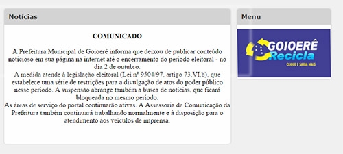 No site de Goioerê ainda está no ar aquele aviso que não é permitido a postagens de matérias no período eleitoral.