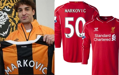 Telespectador de Campo Mourão desavisado que der uma passadinha pela Premier League (leia-se campeonato inglês) pode levar um susto. A empresa mourãoense Marcovic patrocinando o Hull City? Calma, que não é bem isso. Markovic (com K) é o nome do jogador. Lazar Markovic é sérvio e já jogou no Benfica e Sporting (Portugal), mas ainda pertence ao Liverpool (camisa à dir.), que o emprestou ao Hull. Em todo caso, o empresário Marco Antonio Kunzler não vai reclamar do “merchanzinho” na faixa, vai?...