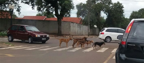 Flagrante feito nesta segunda-feira na av. Irmãos Pereira, esquina com a rua Brzezinski. A matilha atravessa a rua educamente sobre a faixa de segurança, como manda o figurino.