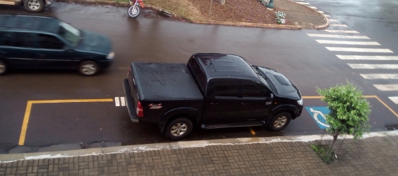 Na av. Irmãos Pereira, centro de Campo Mourão, camionete estaciona bem no meio das vagas reservadas para idosos e deficientes físicos.