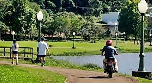 Foto motrando moto trafegando pela pista de caminhadas do Parque do Lago deu o que falar no Facebook. “Em pleno horário de pico de pedestres, moto e motoqueiro desfilam na pista”, escreveu o jornalista Wille Bathe Jr.