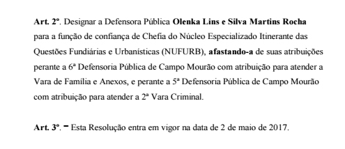 Durou apenas seis meses a passagem da defensora pública Olenka Lins e Silva Martins Rocha por Campo Mourão.