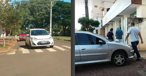 2) Em outro trecho do centro de Campo Mourão, carro estaciona atravessado pela calçada, obrigando os pedestres a desviaram por onde der. Mais um caso do famoso “um minutinho só”.