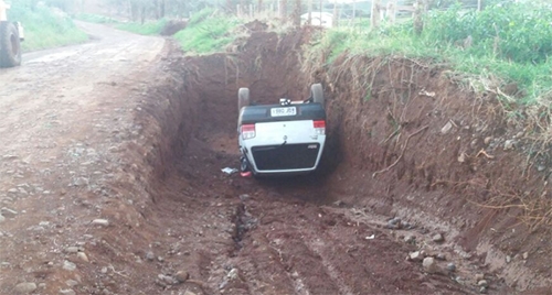 A clic é deste domingo, em Altamira do Paraná. O Fiat Uno caiu no buraco à beira da estrada do Laranjal e capotou. Por sorte, ninguém se feriu. Como isso foi acontecer? O motorista teria perdido o controle ao se atrapalhar com o sol no rosto. E o que o buracão faz ali? Teria sido feito por uma empresa para retirada de terra. Hummmm...