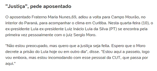 Matéria do portal UOL sobre a baixa adesão de manifestantes contra o ex-presidente Lula incluiu entrevista com o mourãoense Fraterno Maria Nunes. O aposentado é conhecido em Campo Mourão pelas manifestações ateístas. Ele contou à reportagem que estava em Curitiba a passeio e foi conferir o movimento. Fraterno disse que espera que o juiz Sérgio Moro decrete a prisão de Lula.