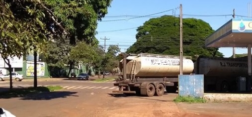 Na av. Goioerê, caminhão bitrem para em posto de combustível e a segunda carreta fica atravessada sobre a calçada, obrigando os pedestres a desviarem pelo meio da rua.