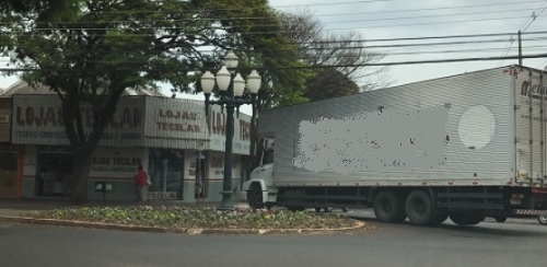 Fora de horário de carga e descarga, caminhão trafega pela av. Capitão Índio Bandeira, passa em frente à prefeitura pela rua Brasil e entra na av. Manoel Mendes de Camargo, subindo na calçada para fazer a manobra. As fotos são desta segunda-feira.