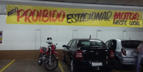 O aviso é claro: moto não pode estacionar nesse local aí. Mesmo assim, duas pararam no local (uma está encobertas, mas são duas). A foto é o fim de semana num supermercado de Campo Mourão.