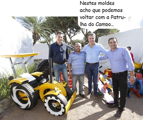 Olha aí mais um clic do governador Beto Richa, domingo, na Festa da Vaca Atolada, em Boa Esperança. Está junto com o prefeito Zé do Caixão e com o deputado federal Sérgio Souza. O tratorzinho em exposição é feito de pneus velhos. Já as máquinas da Patrulha do Campo, que eram de verdade, nunca mais, hein?...