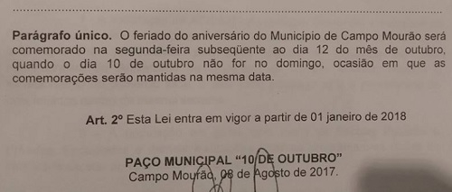 O projeto diz que o aniversário da cidade passaria a ser feriado na segunda-feira após o 12 de outubro (feriado nacional).