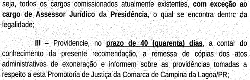 O Ministério Público enviou recomendação para a Câmara de Campina da Lagoa demitir os cargos em comissão.