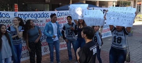 Um grupo (pequeno) de sindicalistas e de estudantes protesta nesta sexta-feira pela manhã no calçadão de Campo Mourão. É contra as propostas de reforma trabalhista e da Previdência do presidente Michel Temer. O protesto inclui faixas, panfletos e músicas com paródias sobre a situação política do País. A "greve geral" fechou as agências bancárias de Campo Mourão, mas elas devem funcionar depois do meio-dia.