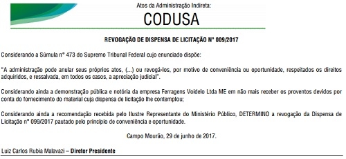 A Codusa revogou a dispensa de licitação em que comprou chapas de aço de empresa da família do vice-prefeito Beto Voidelo.