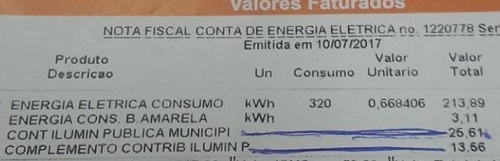 Parece estranho, mas isso apareceu na conta de luz da vereadora Nelita Piacentini, no valor de R$ 13,56.