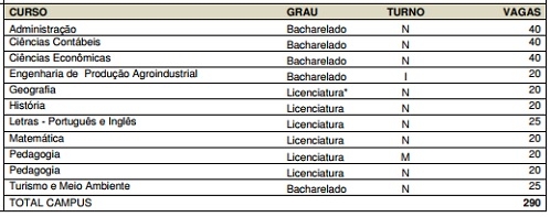 Para o câmpus de Campo Mourão são 290 vagas em 10 cursos.
