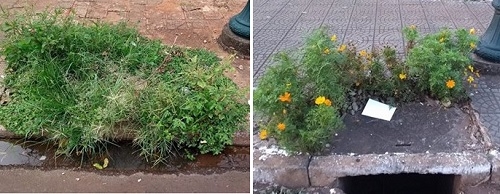 Acontece de tudo com os bueiros de Campo Mourão. Os dois das fotos acima ficam na av. Goioerê a apenas 100 metros um do outro. O primeiro, na esquina da rua Harrison José Borges, foi dominado pelo mato. Já o segundo, "pra não dizer que não falei das flores", fica na esquina com a rua Brasil e ficou todo florido.
