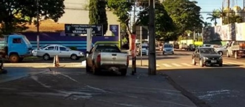 Cena comum em Campo Mourão. Calçada com guia rebaixada para entrada em posto de combustível acaba virando estacionamento. A foto a rua São Josafat, esquina com av. Goioerê.