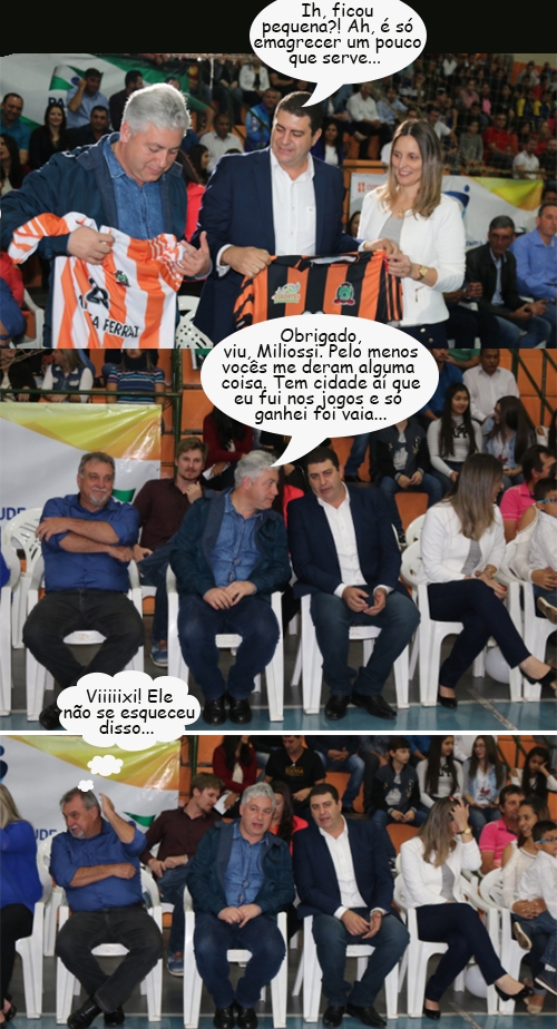Os cliques são da abertura da fase regional dos Jogos da Juventude do Paraná, sexta-feira, em Barbosa Ferraz. O secretário de Estado Douglas Fabrício (Esporte e Turismo) prestigiou o evento e ganhou uma camisa do município sede das mãos do prefeito Edenilson Miliossi. Reparou? Camisa número 23! O prefeito de Ubiratã, Baco Duarte, acompanhou a cerimônia ao lado de Douglas.